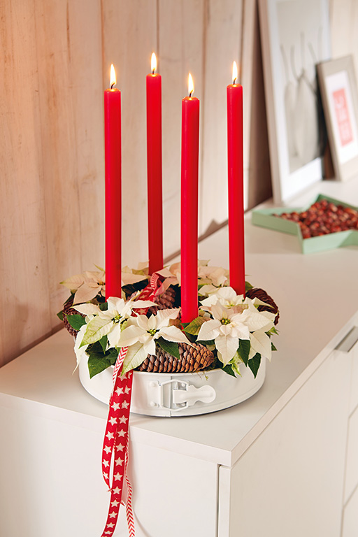 Ihr benötigt hierfür eine alte, runde Backform, weißes Farbspray, 4 rote Stabkerzen, 4 Kerzenhalter, Zapfen, Folie, Steckschaum, etwas Blumenerde und Moos sowie 4 Mini-Weihnachtssterne.