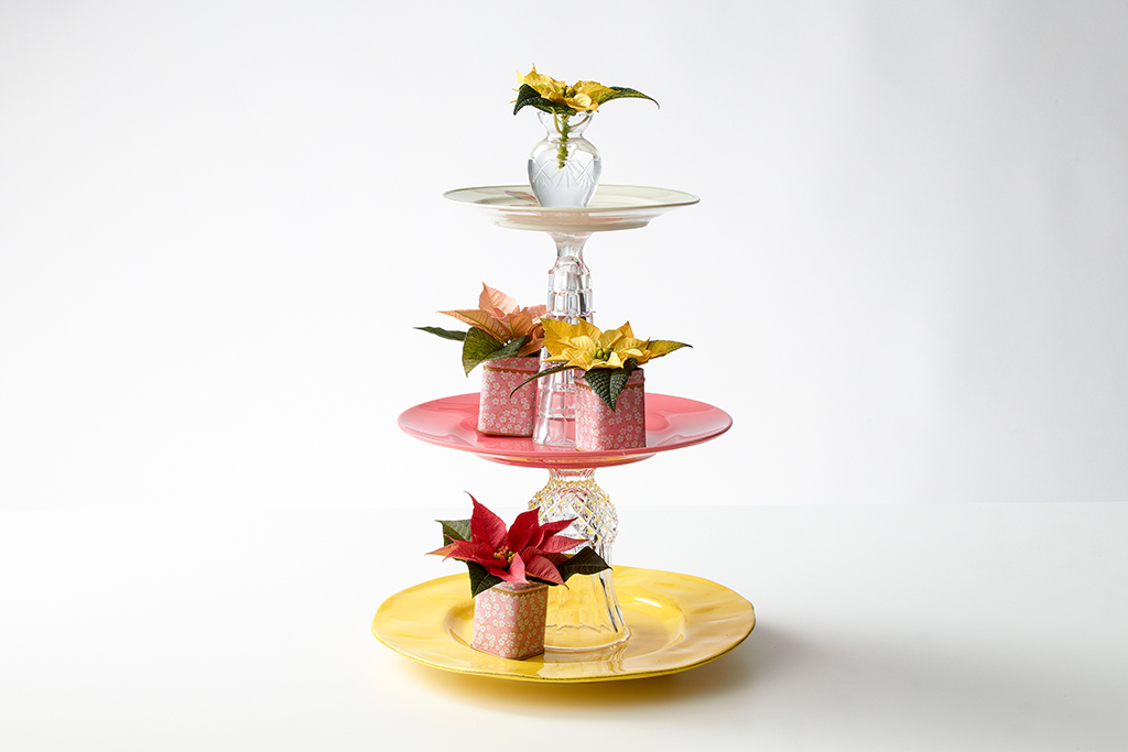 Eine tolle Upcycling Idee: Nehmt drei unterschiedlich große Teller, schöne Gläser, eine kleine Glasvase, bunte Mini-Weihnachtssterne sowie kleine Teedosen als Pflanzgefäße. Nun wird mit den Gläsern und den Tellern eine Etagere gebaut. Damit es richtig stabil ist, klebt ihr Gläser und Teller mit der Heißklebepistole zusammen. Nun pflanzt ihr die Sterne in die Teedosen, verteilt sie auf der Etagere und stellt auf den obersten Teller die kleine Glasvase, befüllt sie mit Wasser und einer abgeschnittenen Weihnachtssternblüte.