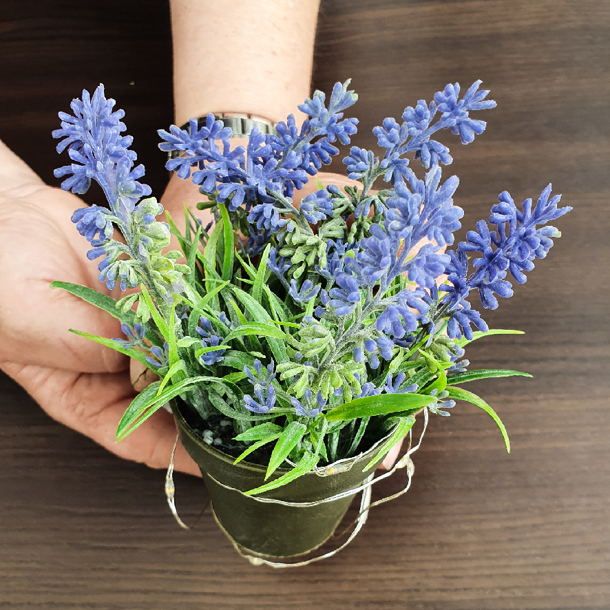 Der Anfang der Lichterkette wird an einem Lavendelhalm fixiert, anschließend den Topf mit der batteriebetriebenen Lichterkette umwickeln.