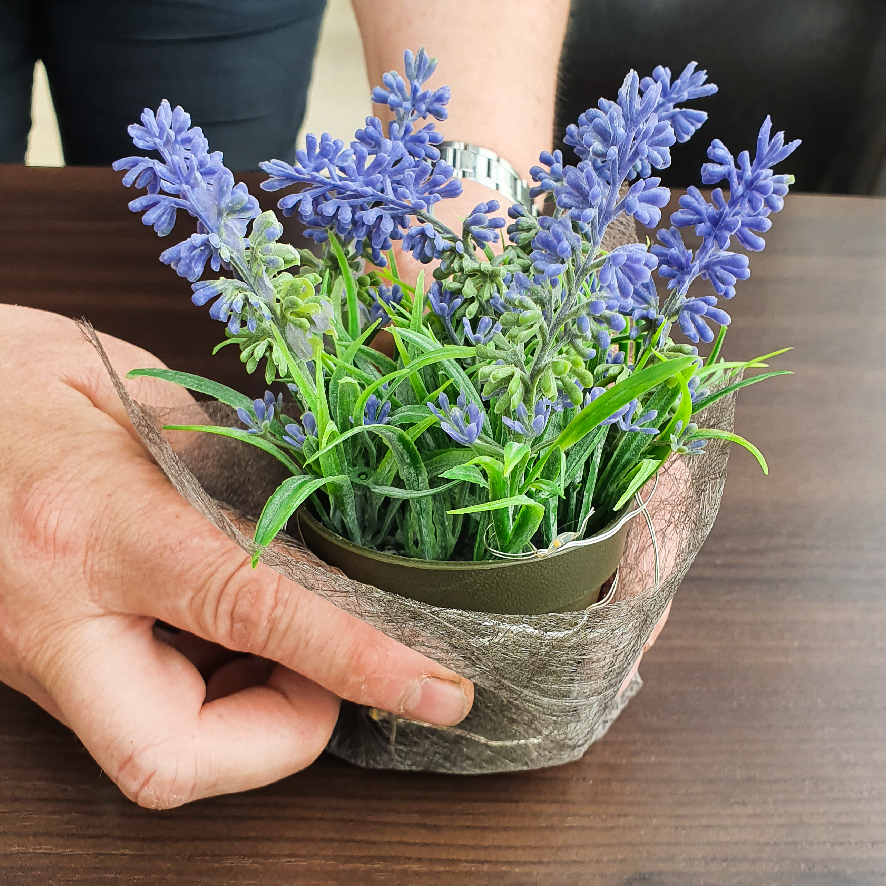 Nun wird der Topf für die hübschere Optik mit Sizoflor oder einem anderen durchscheinenden Gewebe umwickelt.
