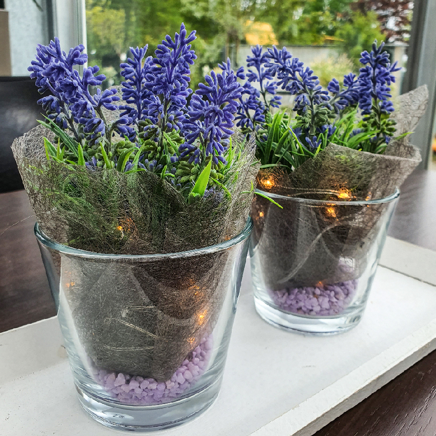 In das befüllte Glasgefäß nun den verzierten Lavendel hinein stellen. Besonders schön wirken mehrere Gläser auf einem Tablett!