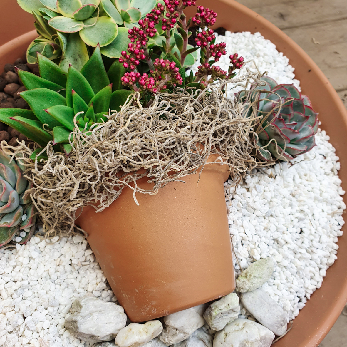 Tillandsienmoos um den Topf drapieren und einige Kieselsteine als imaginären Fußboden unter den Tontopf legen.
