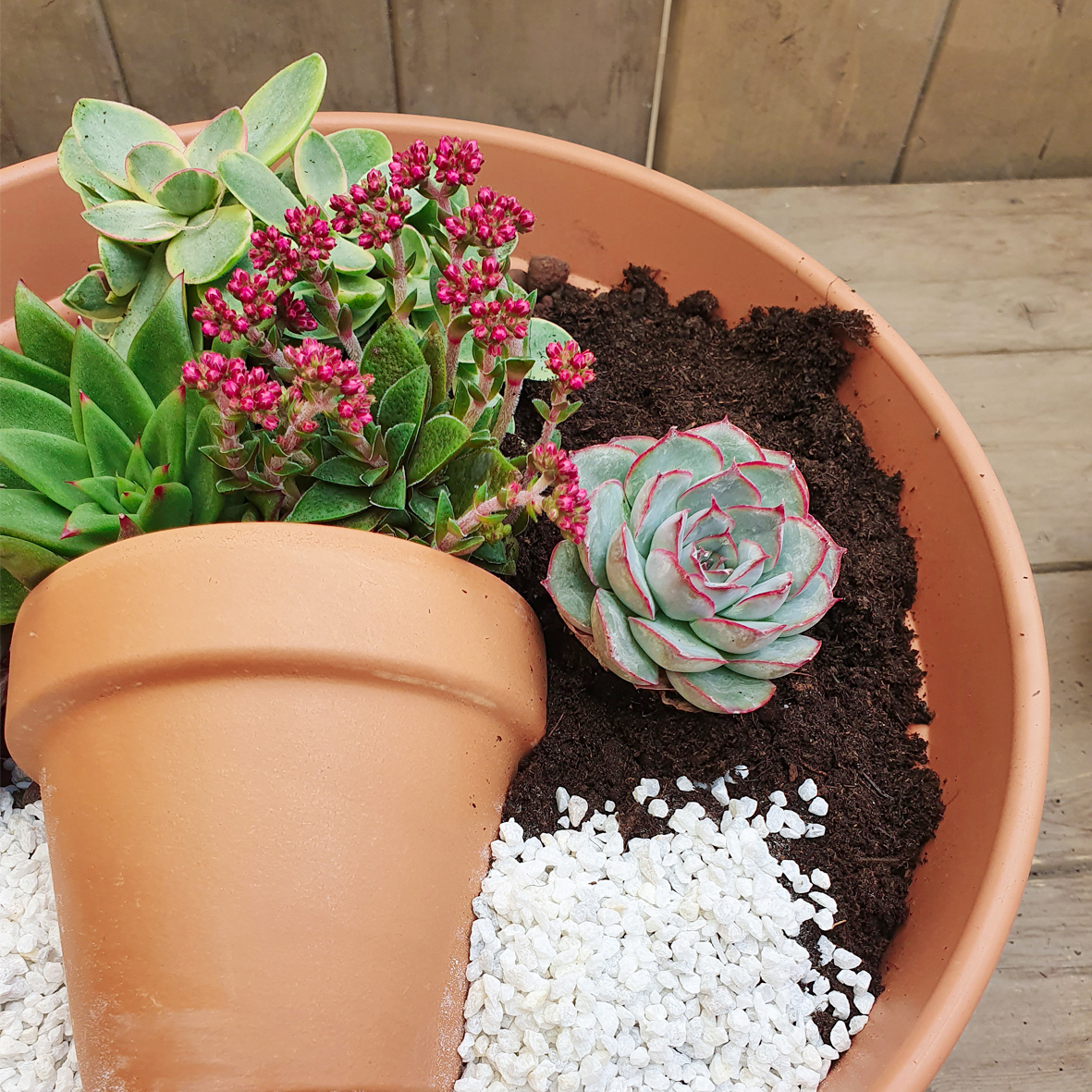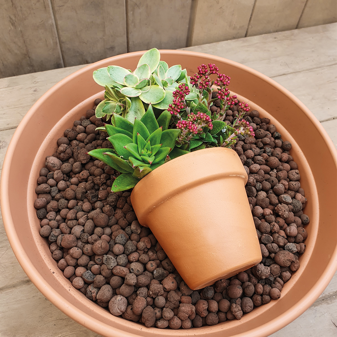 Blähton als Drainage einfüllen und den Tontopf liegend platzieren. Nun die Sukkulenten einstellen, so dass der optische Eindruck einer Topfbepflanzung entsteht.