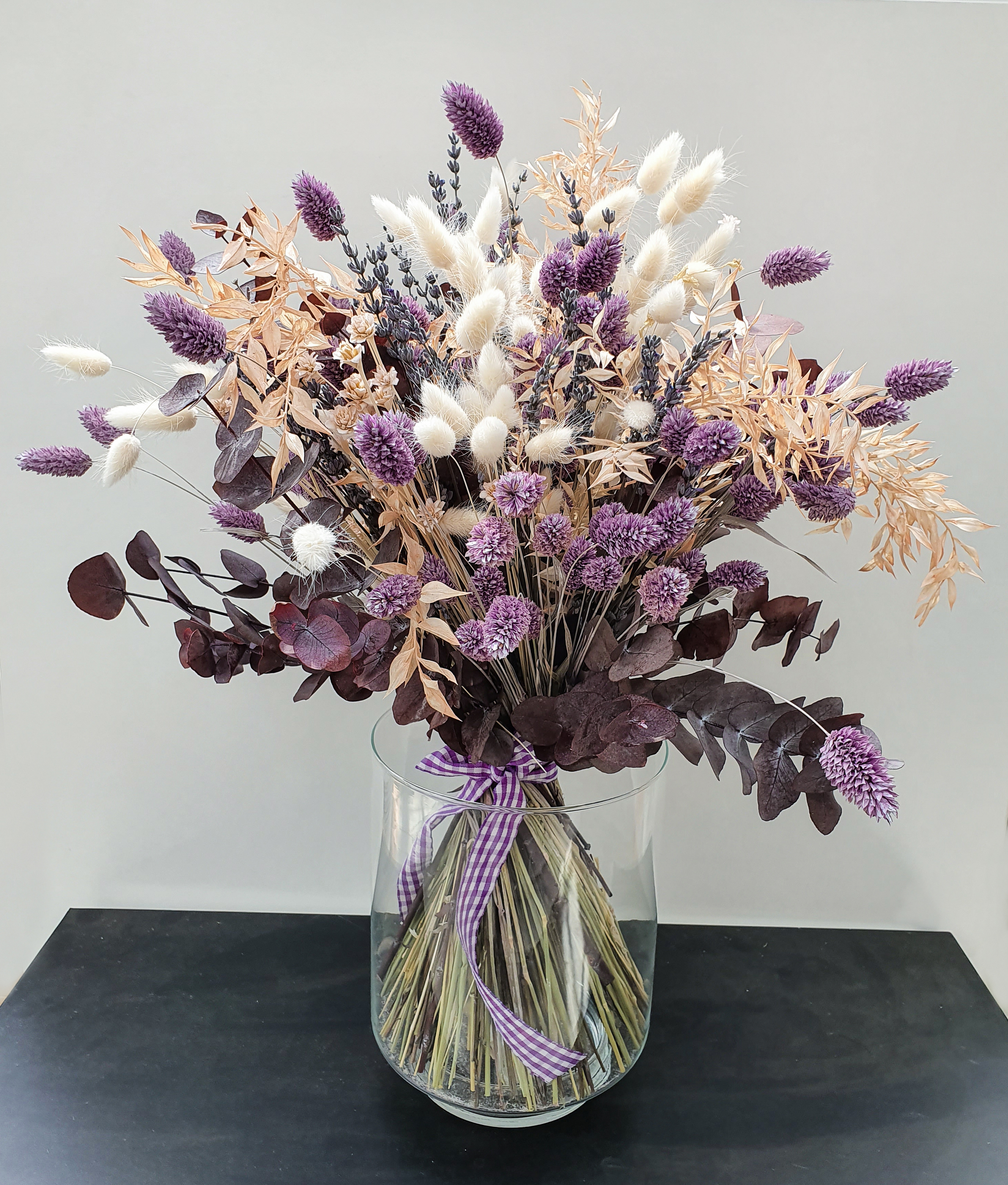Unsere Floristen haben einen Strauß zusammengestellt, mit dem Sie sich den Duft des Südens ins eigene Heim holen können. Duftender Lavendel wurde kombiniert mit Bunny Tails, Eukalyptus, Phalaris und Ruscus. Der Strauß wird wie ein frischer Strauß spiralförmig gebunden und mit einem Draht, der von einer farblich abgestimmten Schleife verdeckt wird, fixiert.
