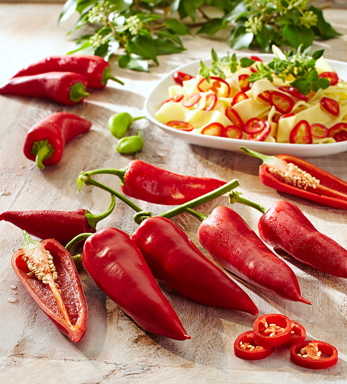 Paprika de Cayenne: Pikante Peperoni zum Würzen. Die langen, roten, vitaminreichen Früchte entwickeln in rohem Zustand einen scharfen, pikanten Geschmack. Sie lieben stets einen sonnigen, windgeschützten Platz. Sie benötigen zum Aufwuchs humosen, durchlässigen, nährstoffreichen Gartenboden. Tipp: Die erste Blüte entfernen, damit die Pflanzen später schneller neue Früchte bilden.