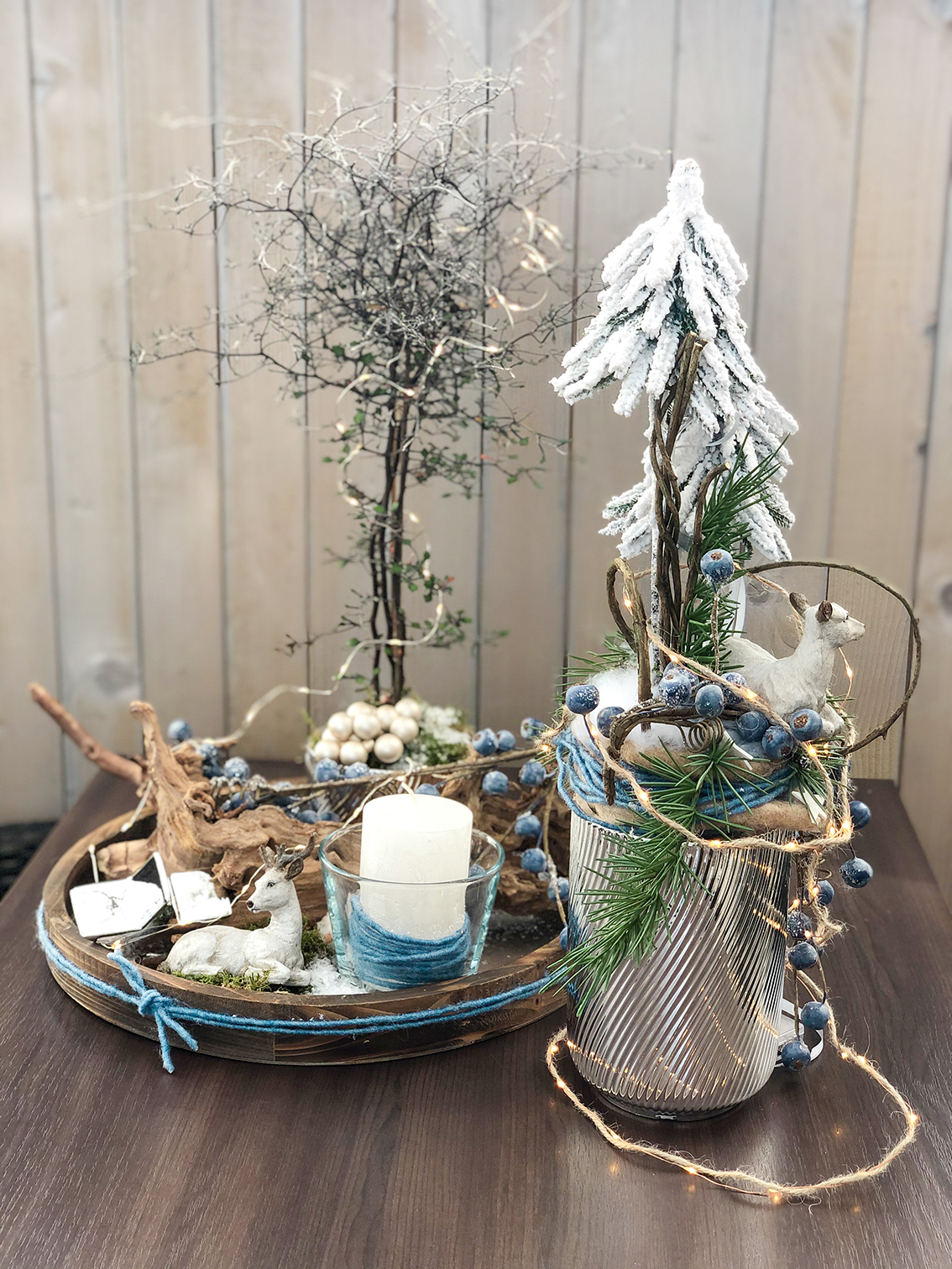 Schnell gemacht sind Dekorationen auf Tabletts. Ideal für das Trendthema „Schneegestöber“ sind Holztabletts in Naturtönen. Akzente in Eisblau lassen sich durch Beerenzweige und ein Windlicht setzen.